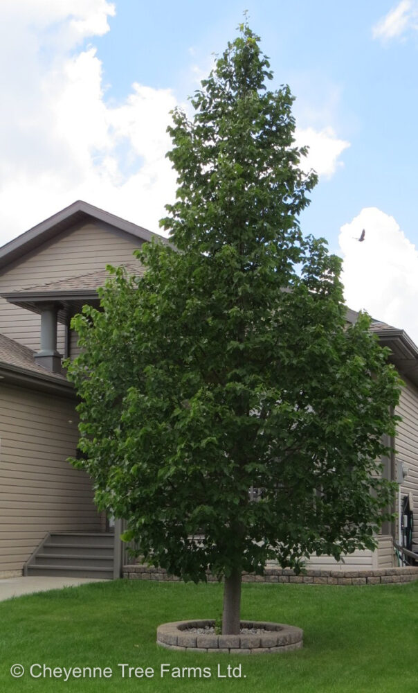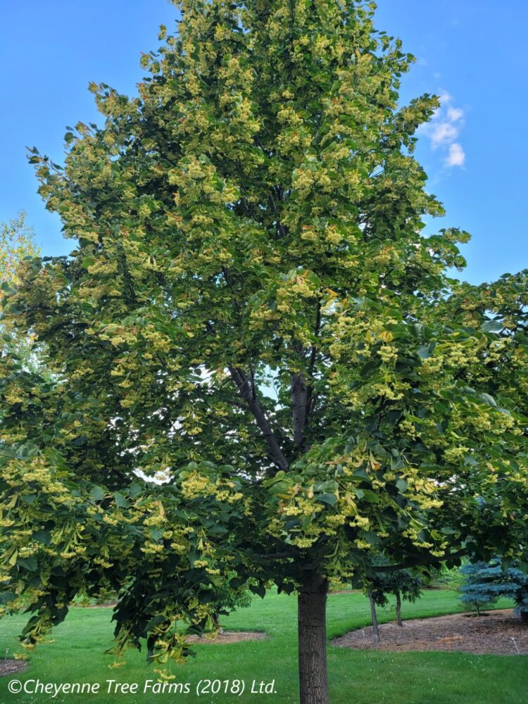 A prairie hardy selection that is resistant to the Linden mite. Strong growing, straight trunk. Large heart shaped leaves, fragrant yellow flowers. Dense pyramidal shape.